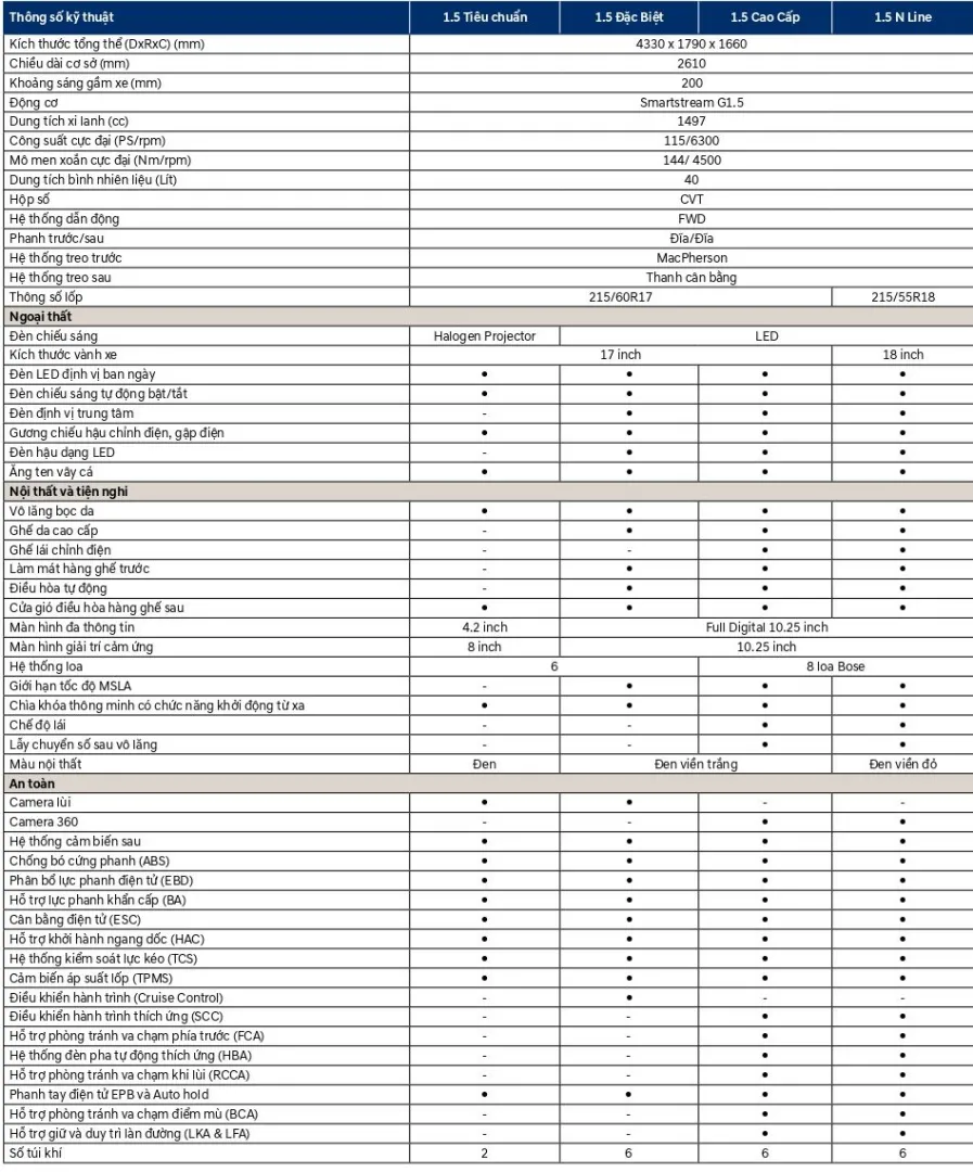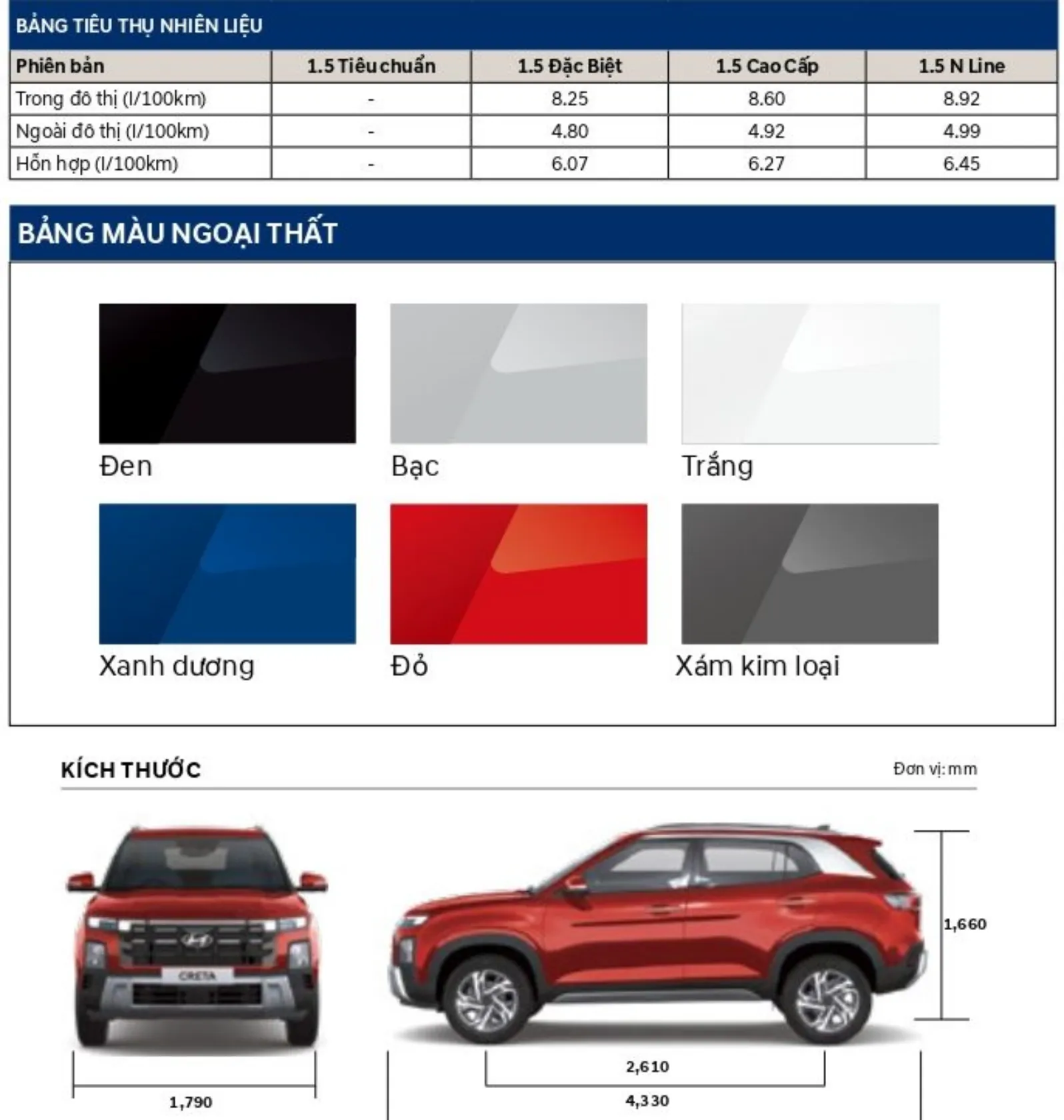 Hyundai New Creta chính thức có mặt tại hệ thống đại lý Hyundai toàn quốc từ ngày 03/06/2025, với phiên bản: Tiêu chuẩn, Đặc biệt và Cao cấp, cùng phiên bản thể thao N Line. Xe có 6 tùy chọn màu sắc: Trắng, Đỏ, Đen, Bạc, Xám Kim loại, Xanh Dương. Xe được bảo hành 5 năm hoặc 100.000 km (tùy điều kiện nào đến trước).